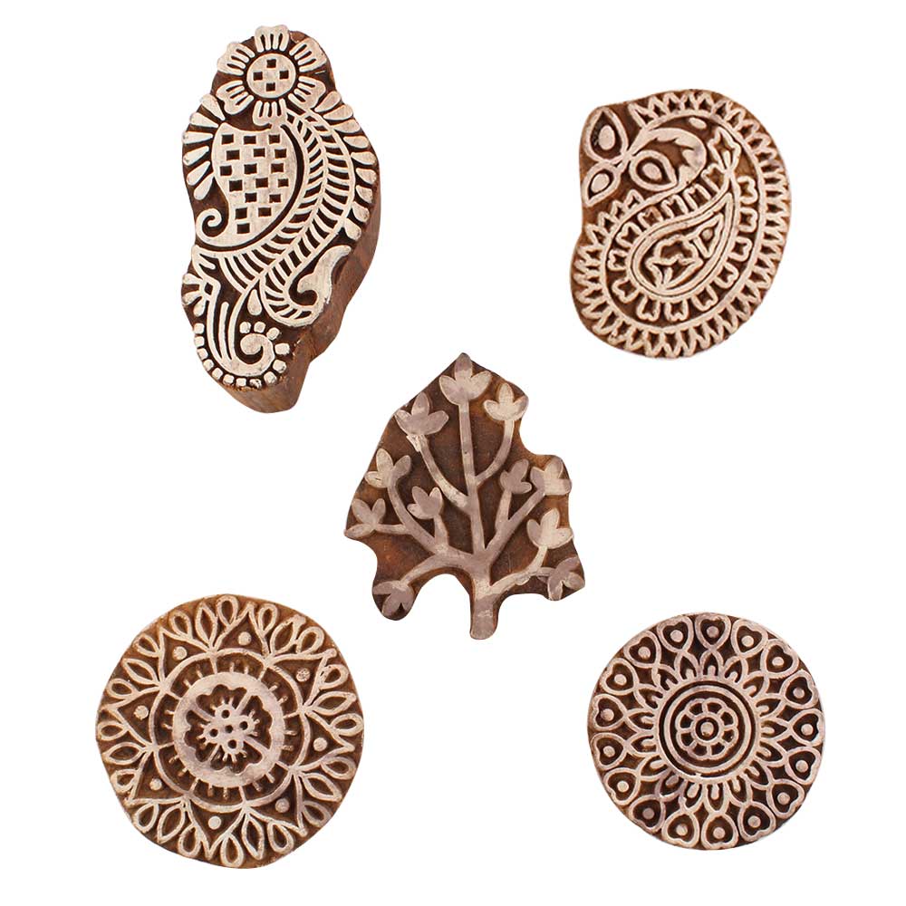 Set of 5 Piece New Mix Wooden Printing Blocks. Ideal for use on Fabric, Paper, Canvas, etc. These Blocks can be use to Print with Oil Colors, Fabric Colors, Water Colors, Acrylic Colors and Vegetable Colors.