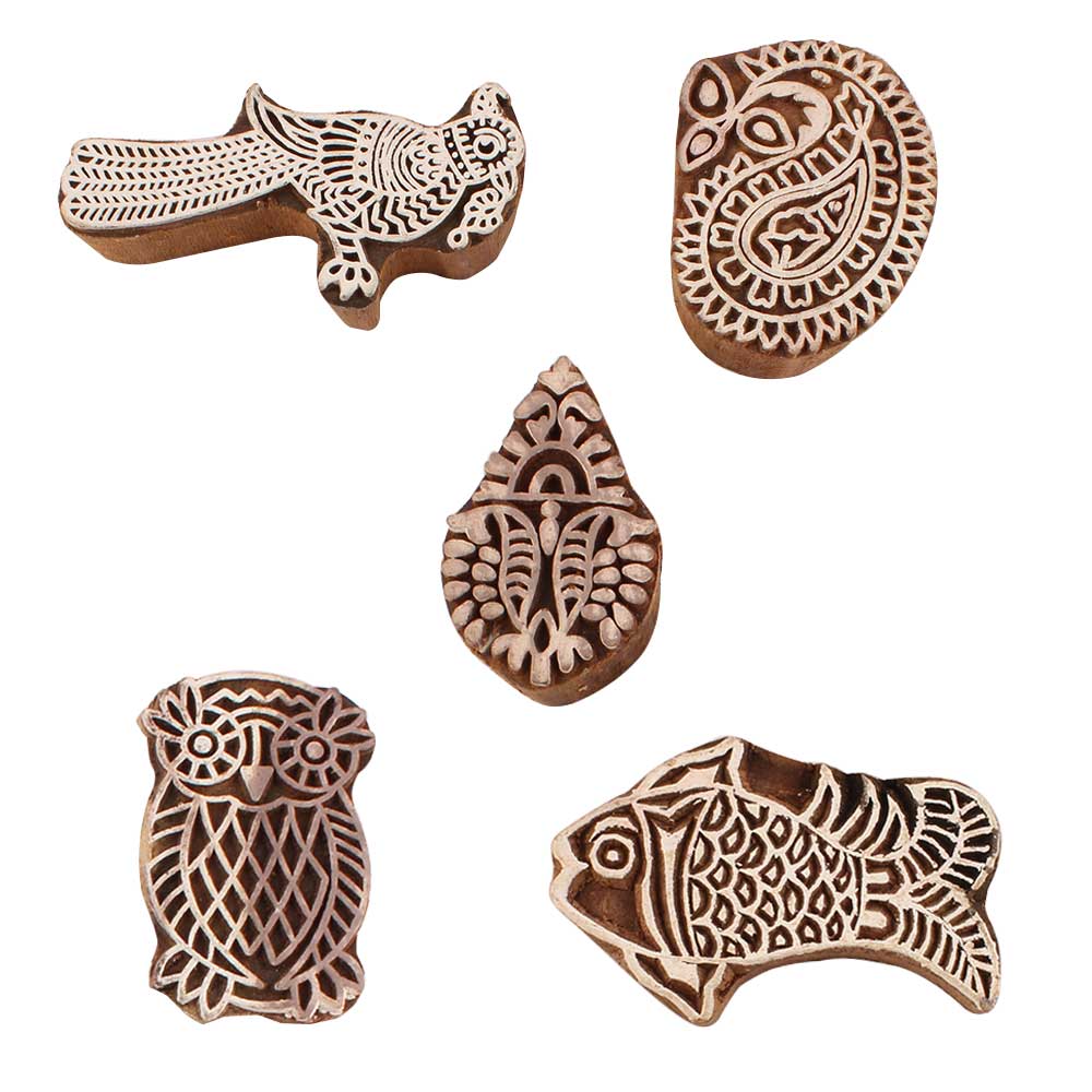 Set of 5 Piece New Mix Wooden Printing Blocks. Ideal for use on Fabric, Paper, Canvas, etc. These Blocks can be use to Print with Oil Colors, Fabric Colors, Water Colors, Acrylic Colors and Vegetable Colors.