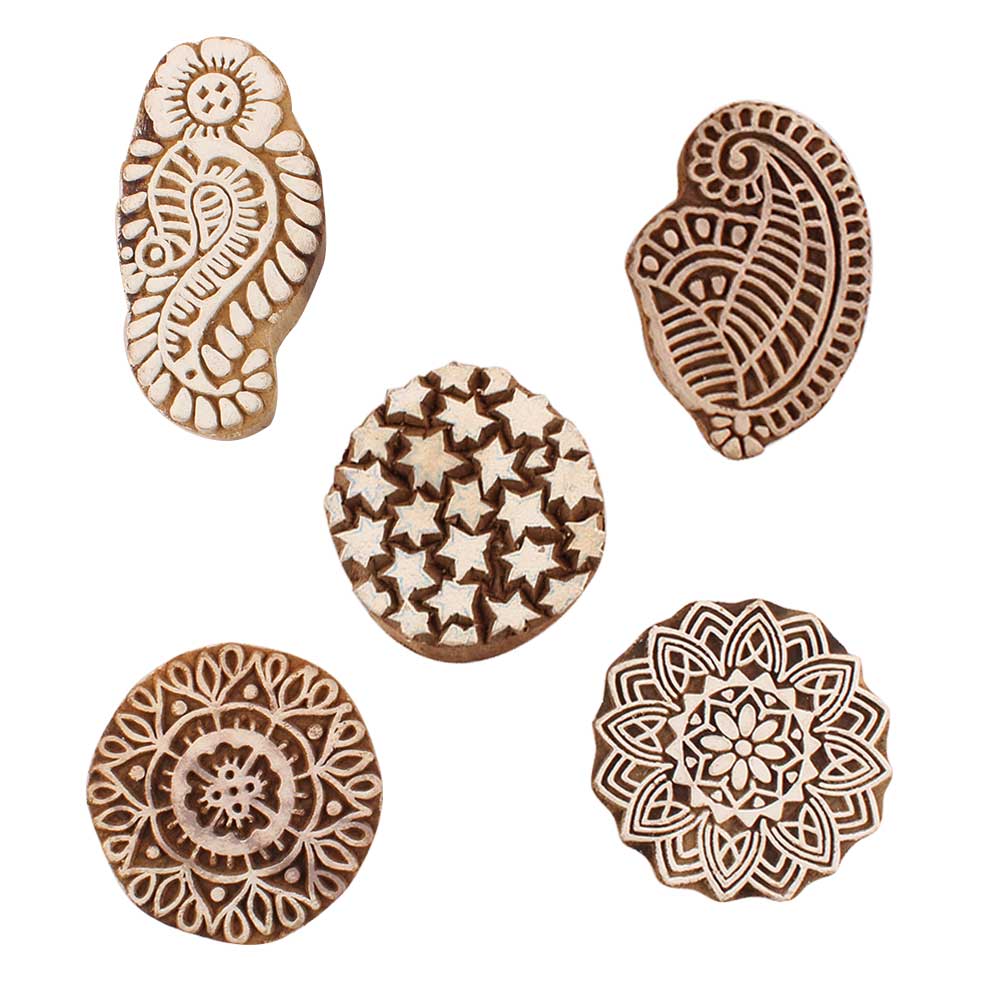 Set of 5 Piece New Mix Wooden Printing Blocks. Ideal for use on Fabric, Paper, Canvas, etc. These Blocks can be use to Print with Oil Colors, Fabric Colors, Water Colors, Acrylic Colors and Vegetable Colors.