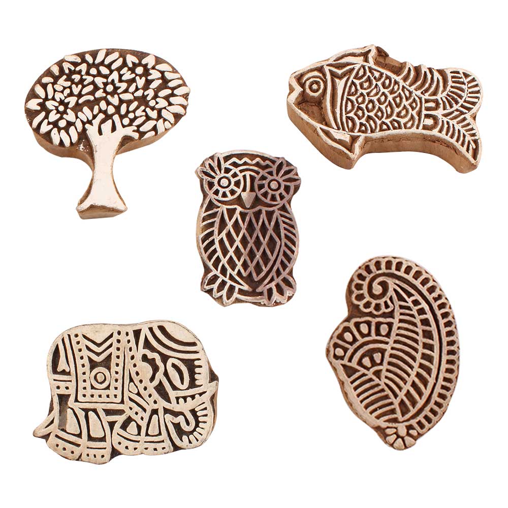 Set of 5 Piece New Mix Wooden Printing Blocks. Ideal for use on Fabric, Paper, Canvas, etc. These Blocks can be use to Print with Oil Colors, Fabric Colors, Water Colors, Acrylic Colors and Vegetable Colors.