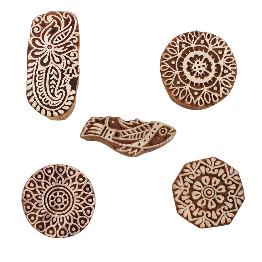 Set of 5 Piece New Mix Wooden Printing Blocks. Ideal for use on Fabric, Paper, Canvas, etc. These Blocks can be use to Print with Oil Colors, Fabric Colors, Water Colors, Acrylic Colors and Vegetable Colors.