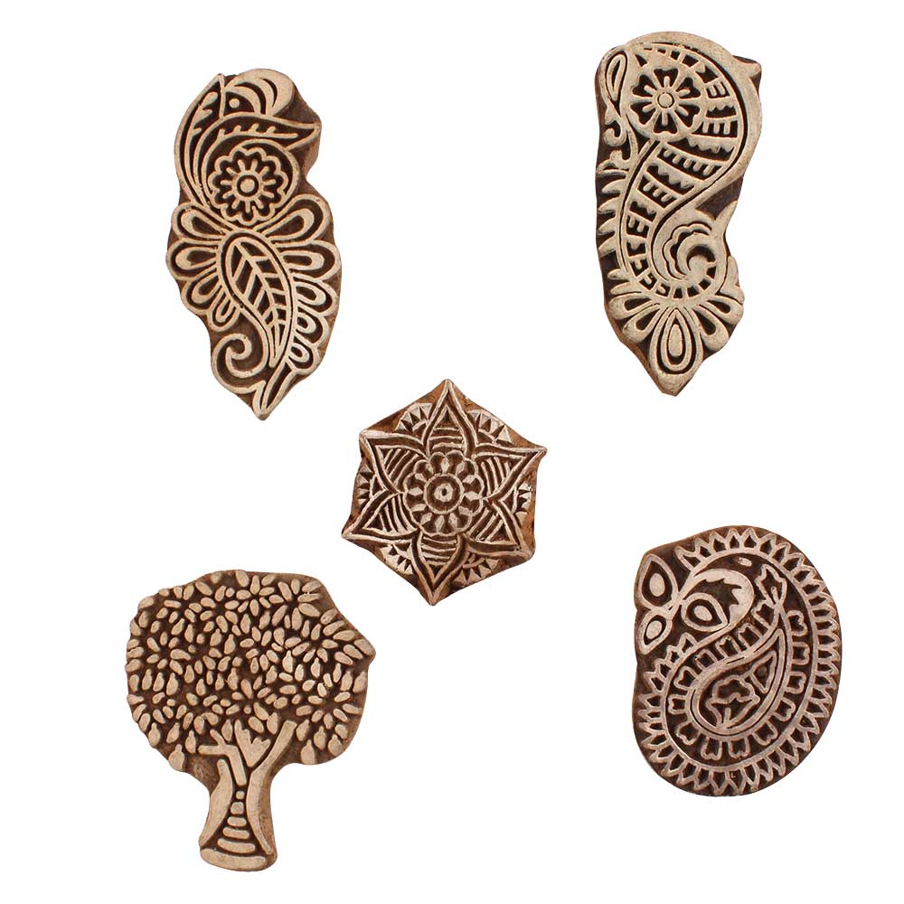 Set of 5 Piece New Mix Wooden Printing Blocks. Ideal for use on Fabric, Paper, Canvas, etc. These Blocks can be use to Print with Oil Colors, Fabric Colors, Water Colors, Acrylic Colors and Vegetable Colors.