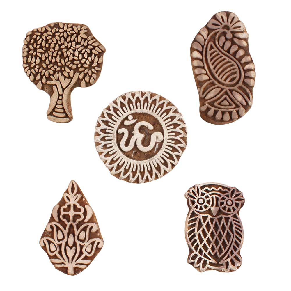 Set of 5 Piece New Mix Wooden Printing Blocks. Ideal for use on Fabric, Paper, Canvas, etc. These Blocks can be use to Print with Oil Colors, Fabric Colors, Water Colors, Acrylic Colors and Vegetable Colors.
