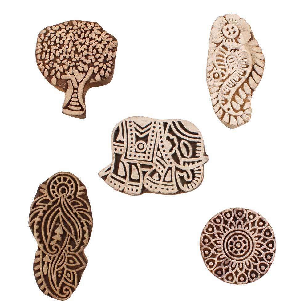 Set of 5 Piece New Mix Wooden Printing Blocks. Ideal for use on Fabric, Paper, Canvas, etc. These Blocks can be use to Print with Oil Colors, Fabric Colors, Water Colors, Acrylic Colors and Vegetable Colors.