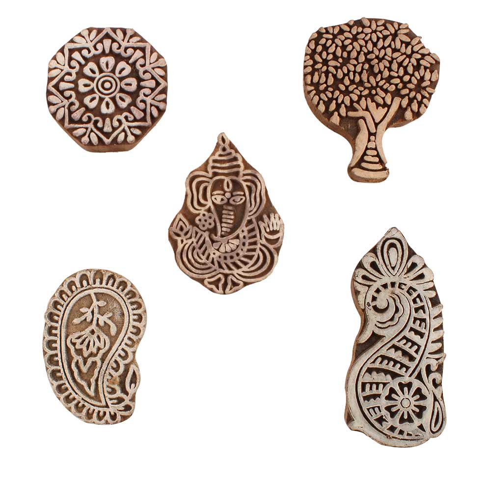 Set of 5 Piece New Mix Wooden Printing Blocks. Ideal for use on Fabric, Paper, Canvas, etc. These Blocks can be use to Print with Oil Colors, Fabric Colors, Water Colors, Acrylic Colors and Vegetable Colors.