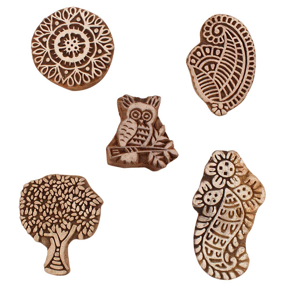 Set of 5 Piece New Mix Wooden Printing Blocks. Ideal for use on Fabric, Paper, Canvas, etc. These Blocks can be use to Print with Oil Colors, Fabric Colors, Water Colors, Acrylic Colors and Vegetable Colors.