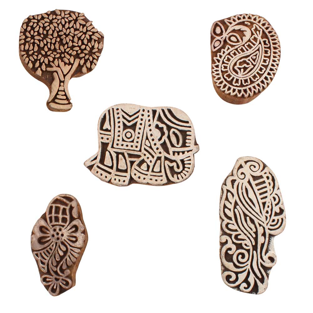 Set of 5 Piece New Mix Wooden Printing Blocks. Ideal for use on Fabric, Paper, Canvas, etc. These Blocks can be use to Print with Oil Colors, Fabric Colors, Water Colors, Acrylic Colors and Vegetable Colors.