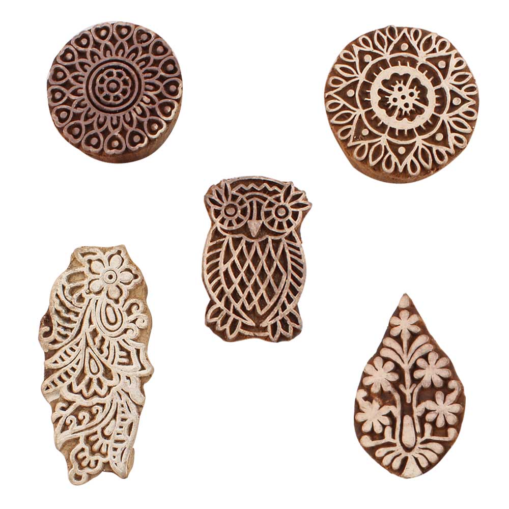 Set of 5 Piece New Mix Wooden Printing Blocks. Ideal for use on Fabric, Paper, Canvas, etc. These Blocks can be use to Print with Oil Colors, Fabric Colors, Water Colors, Acrylic Colors and Vegetable Colors.