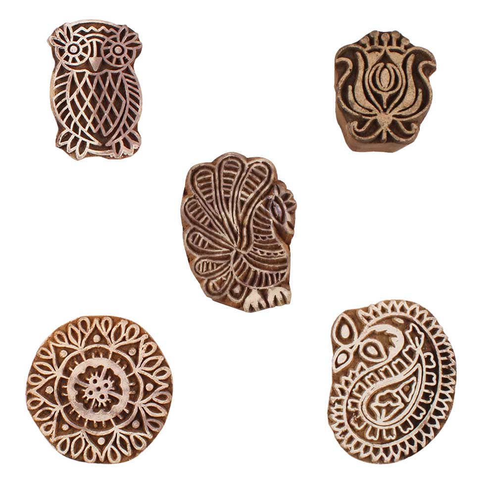 Set of 5 Piece New Mix Wooden Printing Blocks. Ideal for use on Fabric, Paper, Canvas, etc. These Blocks can be use to Print with Oil Colors, Fabric Colors, Water Colors, Acrylic Colors and Vegetable Colors.