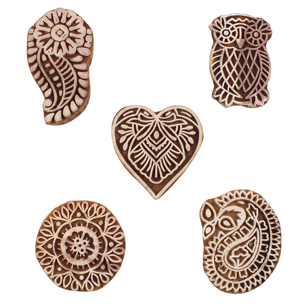 Set of 5 Piece New Mix Wooden Printing Blocks. Ideal for use on Fabric, Paper, Canvas, etc. These Blocks can be use to Print with Oil Colors, Fabric Colors, Water Colors, Acrylic Colors and Vegetable Colors.