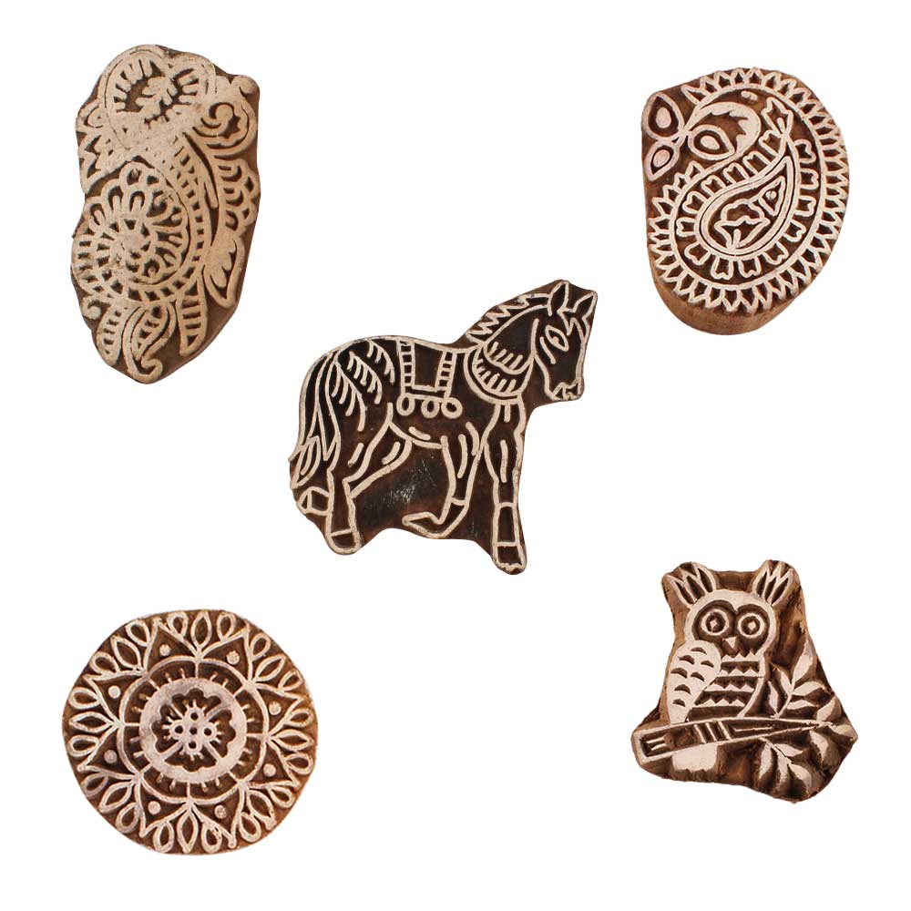 Set of 5 Piece New Mix Wooden Printing Blocks. Ideal for use on Fabric, Paper, Canvas, etc. These Blocks can be use to Print with Oil Colors, Fabric Colors, Water Colors, Acrylic Colors and Vegetable Colors.