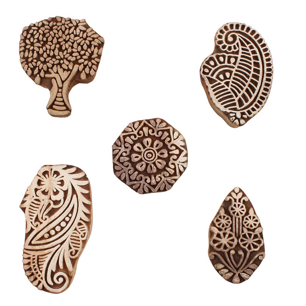 Set of 5 Piece New Mix Wooden Printing Blocks. Ideal for use on Fabric, Paper, Canvas, etc. These Blocks can be use to Print with Oil Colors, Fabric Colors, Water Colors, Acrylic Colors and Vegetable Colors.