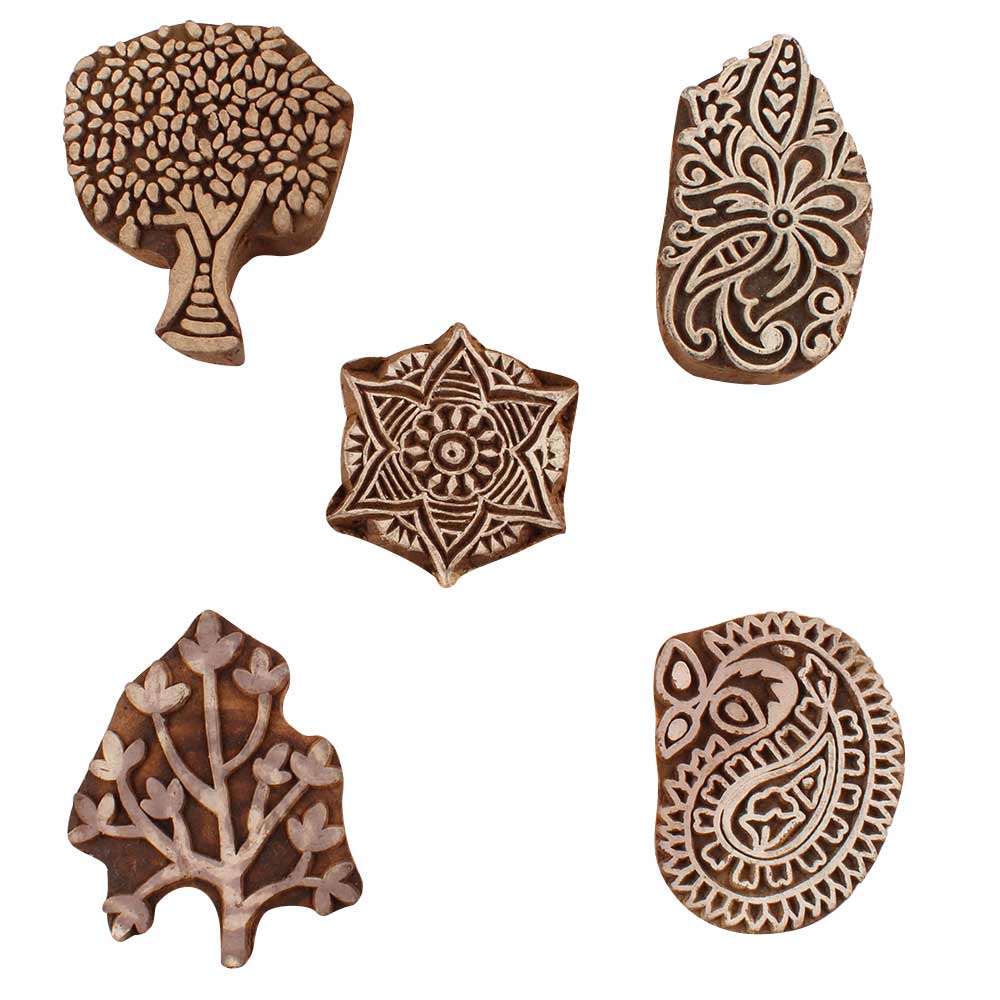 Set of 5 Piece New Mix Wooden Printing Blocks. Ideal for use on Fabric, Paper, Canvas, etc. These Blocks can be use to Print with Oil Colors, Fabric Colors, Water Colors, Acrylic Colors and Vegetable Colors.