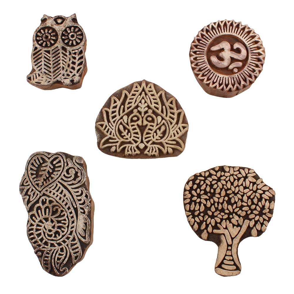 Set of 5 Piece New Mix Wooden Printing Blocks. Ideal for use on Fabric, Paper, Canvas, etc. These Blocks can be use to Print with Oil Colors, Fabric Colors, Water Colors, Acrylic Colors and Vegetable Colors.
