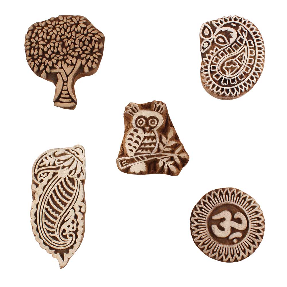 Set of 5 Piece New Mix Wooden Printing Blocks. Ideal for use on Fabric, Paper, Canvas, etc. These Blocks can be use to Print with Oil Colors, Fabric Colors, Water Colors, Acrylic Colors and Vegetable Colors.