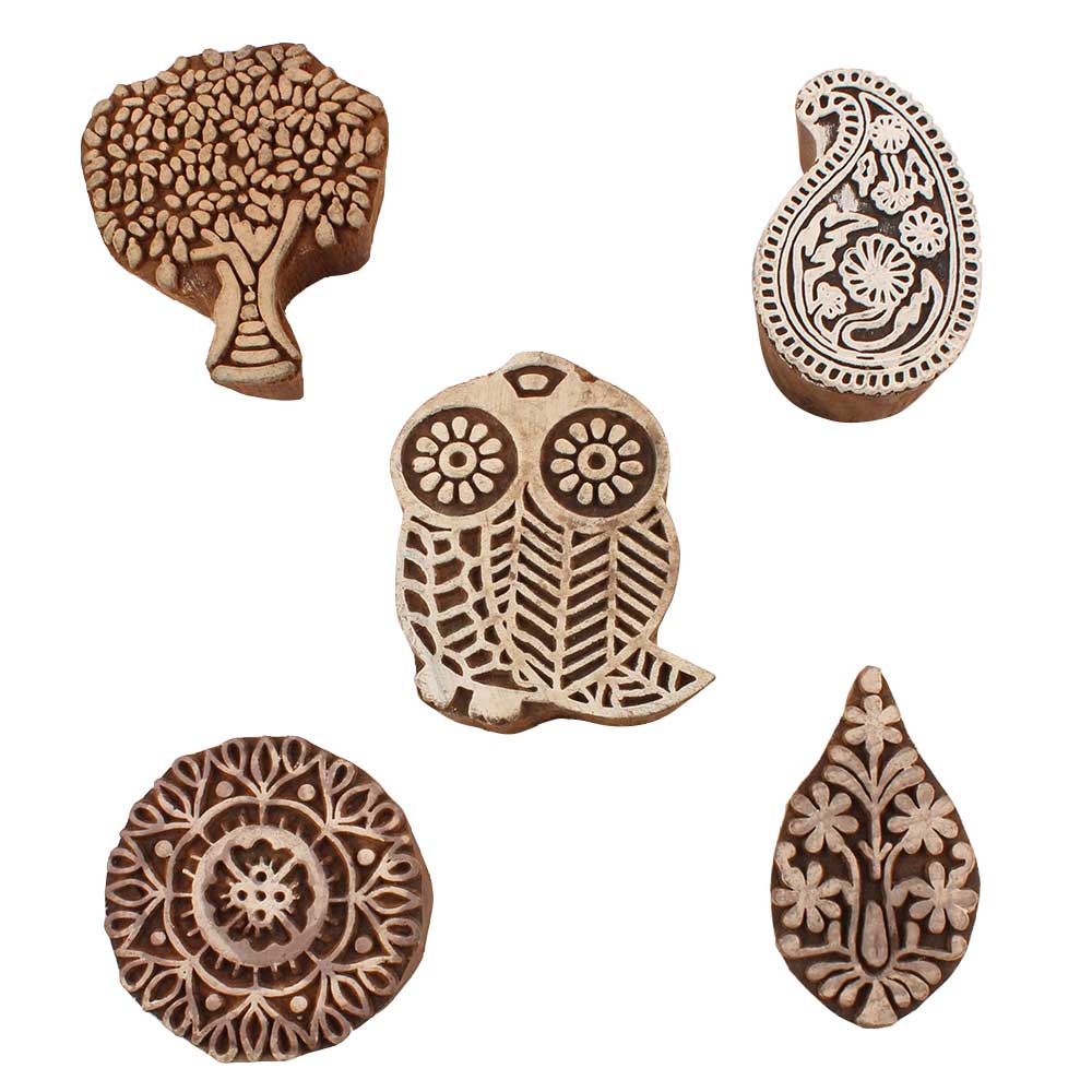 Set of 5 Piece New Mix Wooden Printing Blocks. Ideal for use on Fabric, Paper, Canvas, etc. These Blocks can be use to Print with Oil Colors, Fabric Colors, Water Colors, Acrylic Colors and Vegetable Colors.