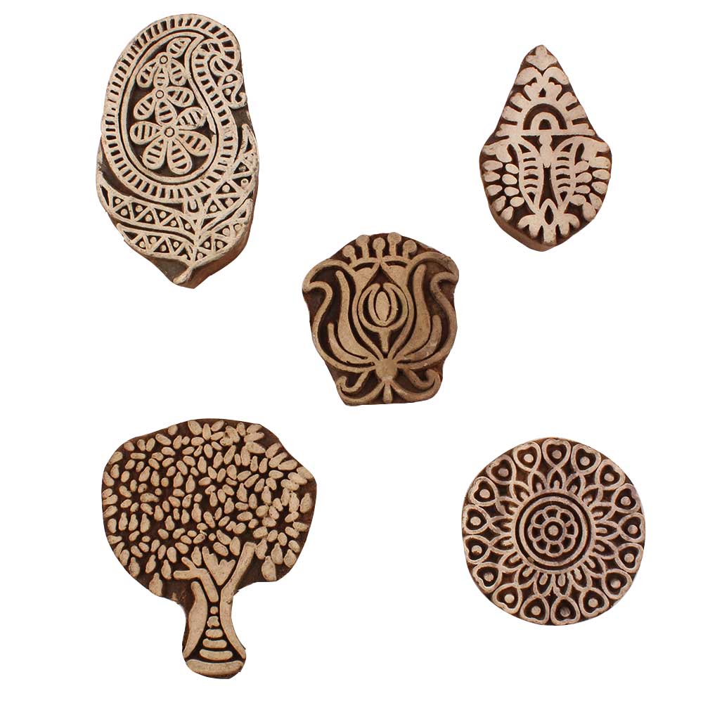 Set of 5 Piece New Mix Wooden Printing Blocks. Ideal for use on Fabric, Paper, Canvas, etc. These Blocks can be use to Print with Oil Colors, Fabric Colors, Water Colors, Acrylic Colors and Vegetable Colors.