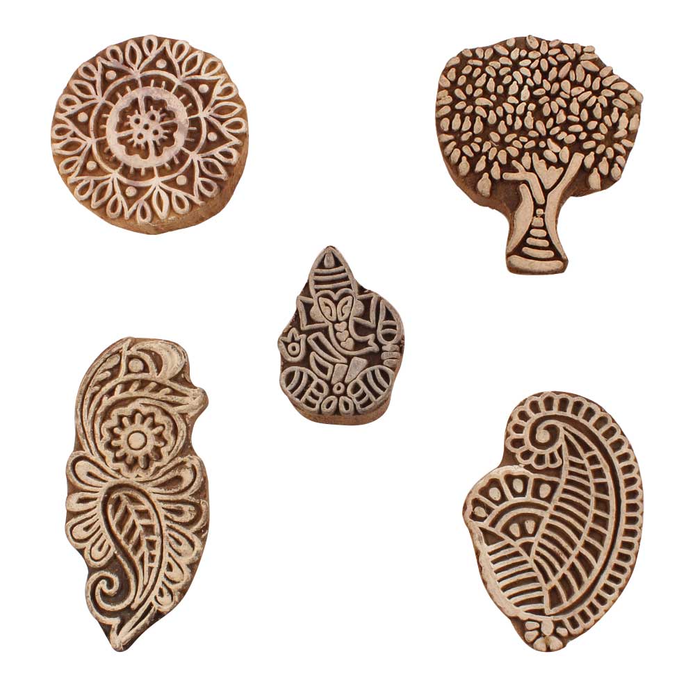 Set of 5 Piece New Mix Wooden Printing Blocks. Ideal for use on Fabric, Paper, Canvas, etc. These Blocks can be use to Print with Oil Colors, Fabric Colors, Water Colors, Acrylic Colors and Vegetable Colors.