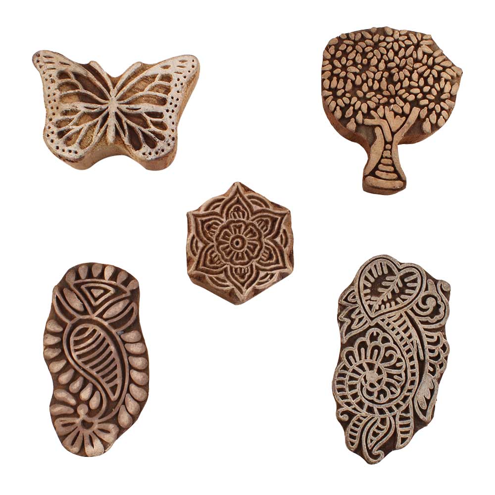 Set of 5 Piece New Mix Wooden Printing Blocks. Ideal for use on Fabric, Paper, Canvas, etc. These Blocks can be use to Print with Oil Colors, Fabric Colors, Water Colors, Acrylic Colors and Vegetable Colors.