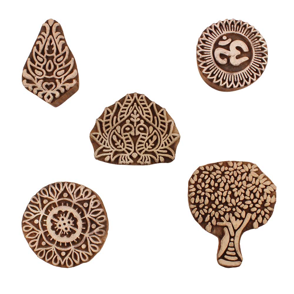 Set of 5 Piece New Mix Wooden Printing Blocks. Ideal for use on Fabric, Paper, Canvas, etc. These Blocks can be use to Print with Oil Colors, Fabric Colors, Water Colors, Acrylic Colors and Vegetable Colors.