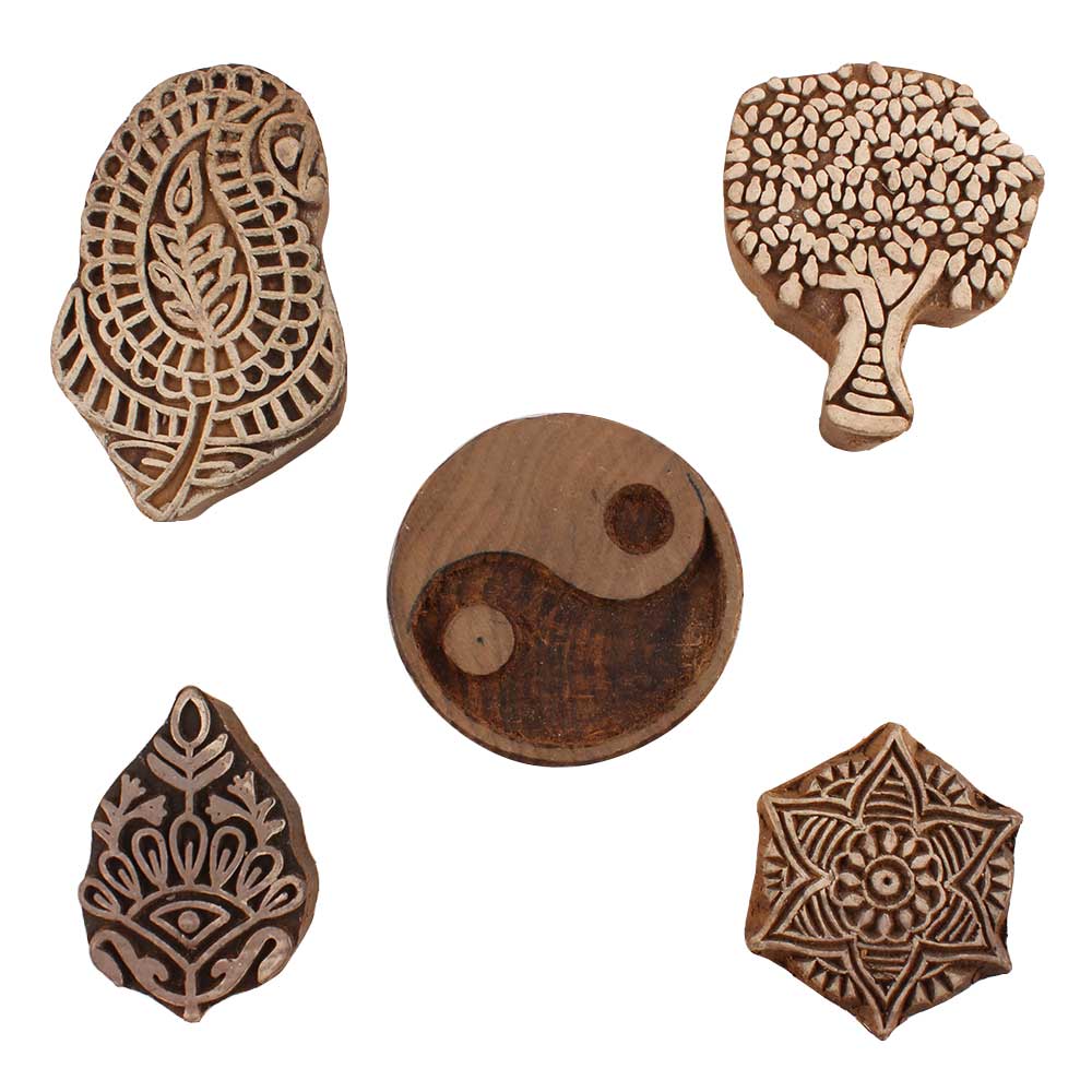 Set of 5 Piece New Mix Wooden Printing Blocks. Ideal for use on Fabric, Paper, Canvas, etc. These Blocks can be use to Print with Oil Colors, Fabric Colors, Water Colors, Acrylic Colors and Vegetable Colors.