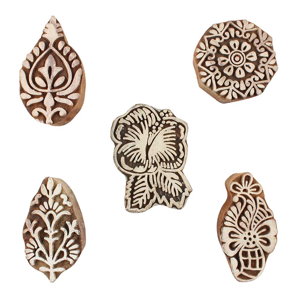 Set of 5 Piece New Mix Wooden Printing Blocks. Ideal for use on Fabric, Paper, Canvas, etc. These Blocks can be use to Print with Oil Colors, Fabric Colors, Water Colors, Acrylic Colors and Vegetable Colors.