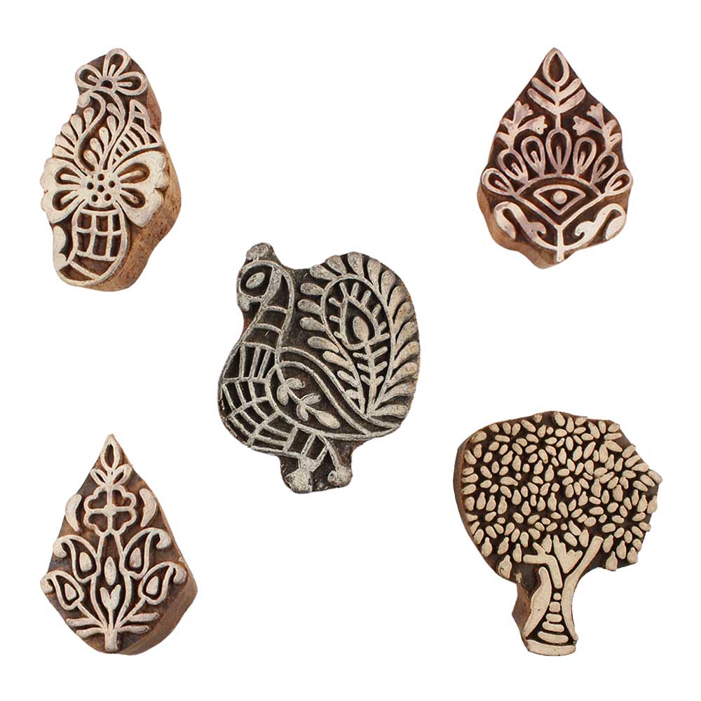 Set of 5 Piece New Mix Wooden Printing Blocks. Ideal for use on Fabric, Paper, Canvas, etc. These Blocks can be use to Print with Oil Colors, Fabric Colors, Water Colors, Acrylic Colors and Vegetable Colors.
