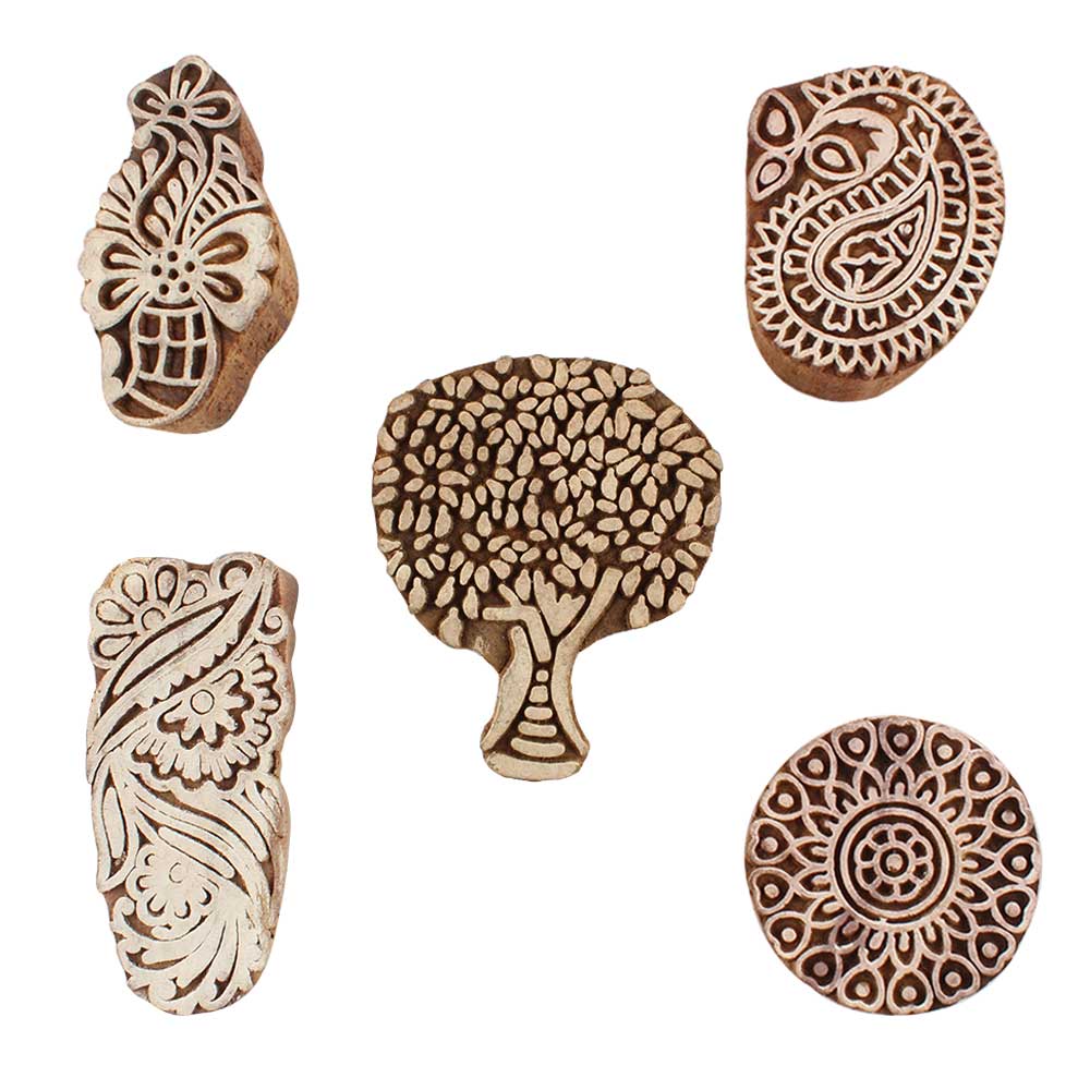 Set of 5 Piece New Mix Wooden Printing Blocks. Ideal for use on Fabric, Paper, Canvas, etc. These Blocks can be use to Print with Oil Colors, Fabric Colors, Water Colors, Acrylic Colors and Vegetable Colors.