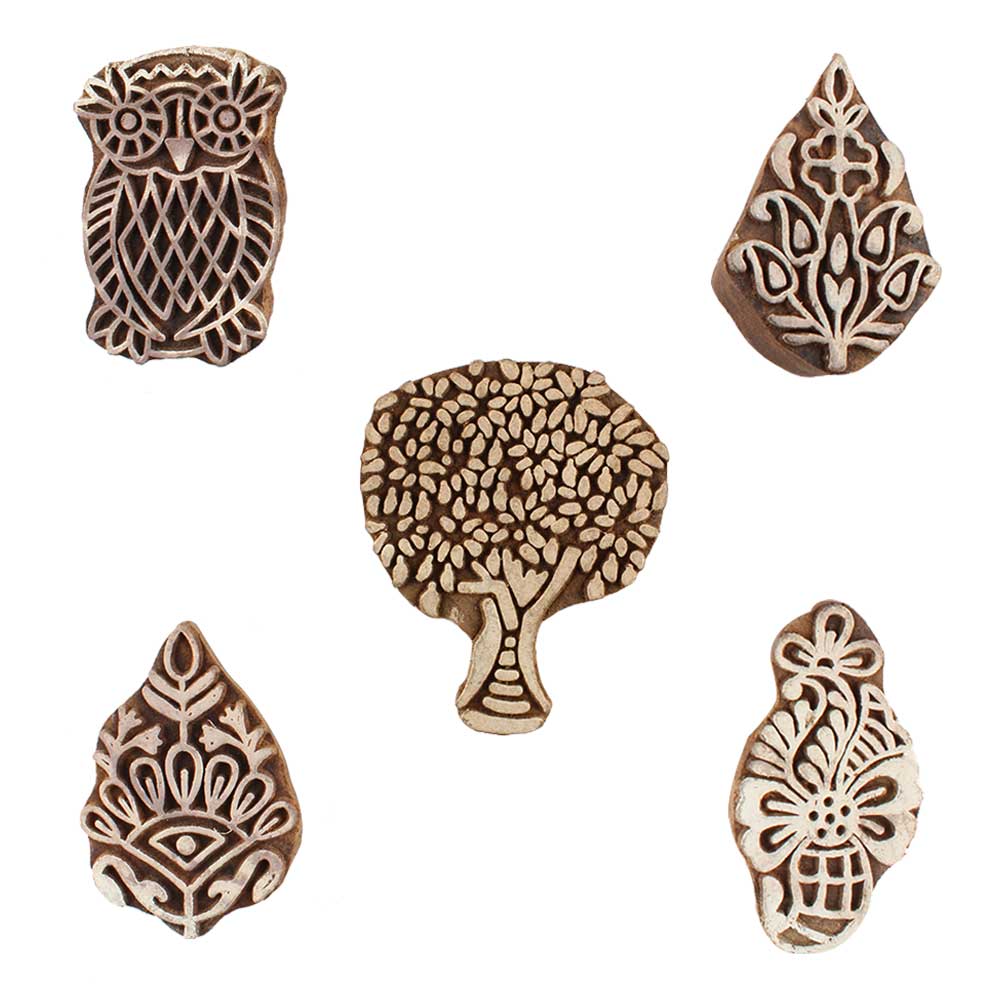 Set of 5 Piece New Mix Wooden Printing Blocks. Ideal for use on Fabric, Paper, Canvas, etc. These Blocks can be use to Print with Oil Colors, Fabric Colors, Water Colors, Acrylic Colors and Vegetable Colors.