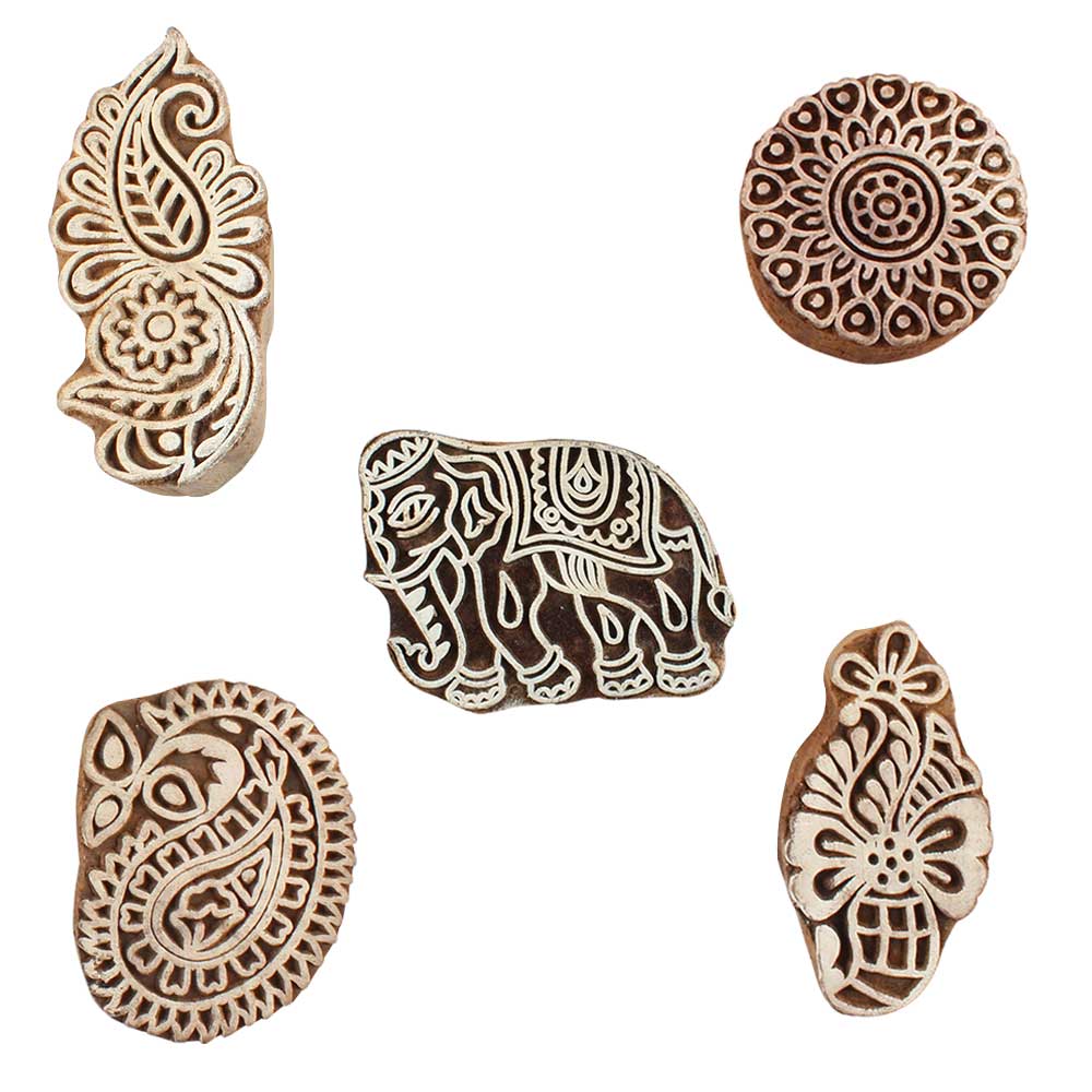 Set of 5 Piece New Mix Wooden Printing Blocks. Ideal for use on Fabric, Paper, Canvas, etc. These Blocks can be use to Print with Oil Colors, Fabric Colors, Water Colors, Acrylic Colors and Vegetable Colors.