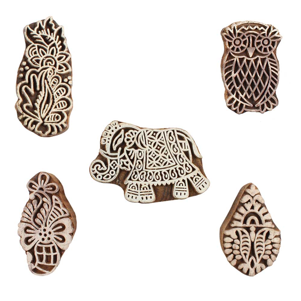 Set of 5 Piece New Mix Wooden Printing Blocks. Ideal for use on Fabric, Paper, Canvas, etc. These Blocks can be use to Print with Oil Colors, Fabric Colors, Water Colors, Acrylic Colors and Vegetable Colors.