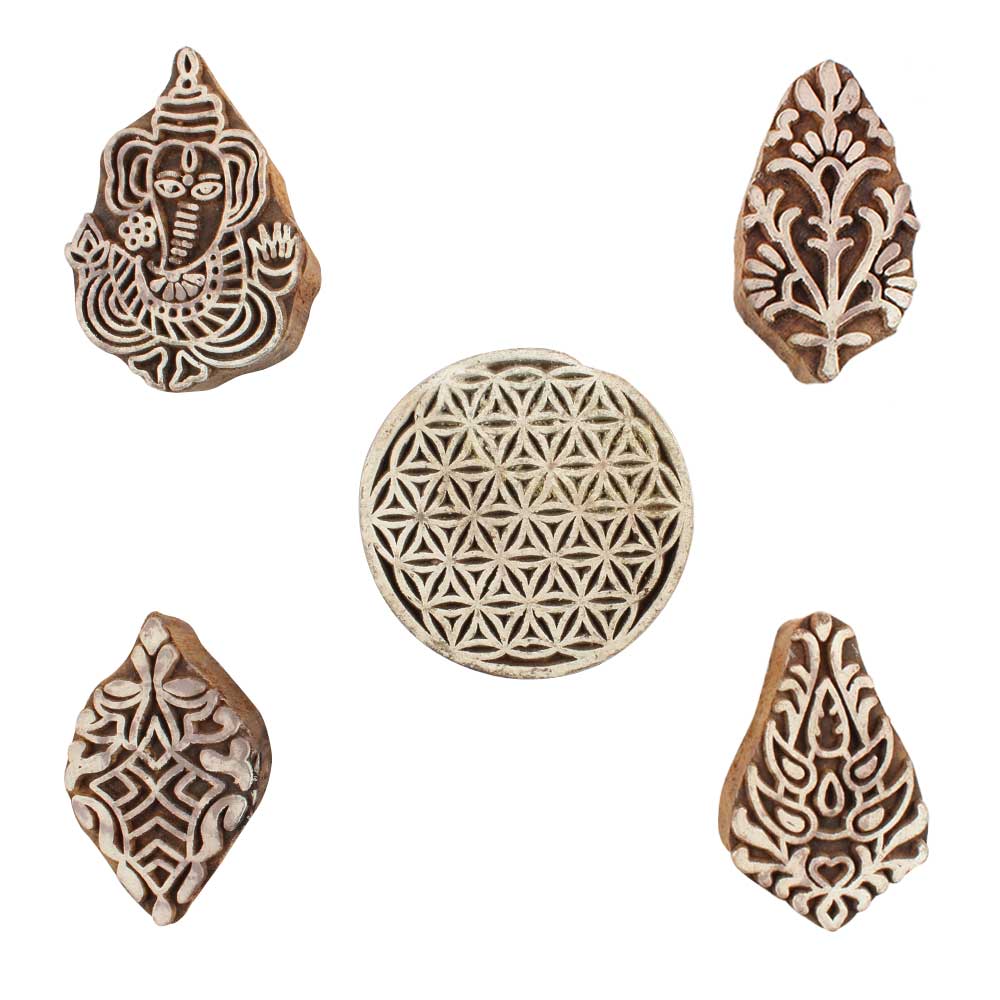 Set of 5 Piece New Mix Wooden Printing Blocks. Ideal for use on Fabric, Paper, Canvas, etc. These Blocks can be use to Print with Oil Colors, Fabric Colors, Water Colors, Acrylic Colors and Vegetable Colors.