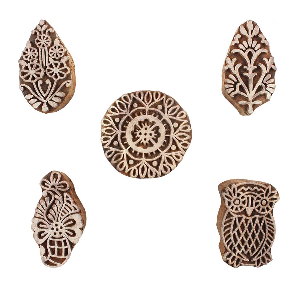 Set of 5 Piece New Mix Wooden Printing Blocks. Ideal for use on Fabric, Paper, Canvas, etc. These Blocks can be use to Print with Oil Colors, Fabric Colors, Water Colors, Acrylic Colors and Vegetable Colors.