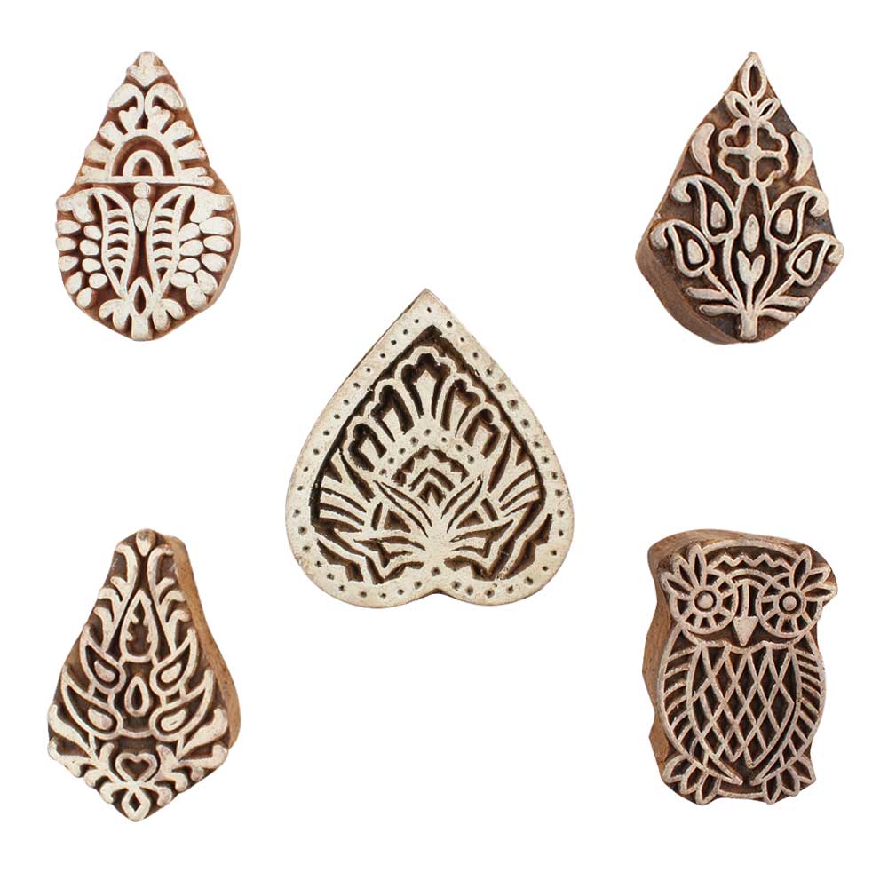 Set of 5 Piece New Mix Wooden Printing Blocks. Ideal for use on Fabric, Paper, Canvas, etc. These Blocks can be use to Print with Oil Colors, Fabric Colors, Water Colors, Acrylic Colors and Vegetable Colors.