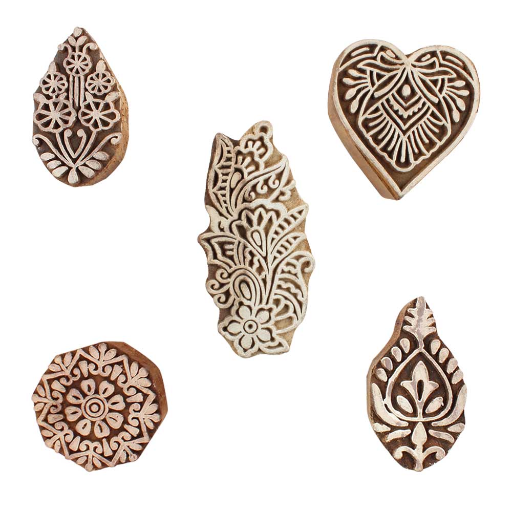 Set of 5 Piece New Mix Wooden Printing Blocks. Ideal for use on Fabric, Paper, Canvas, etc. These Blocks can be use to Print with Oil Colors, Fabric Colors, Water Colors, Acrylic Colors and Vegetable Colors.