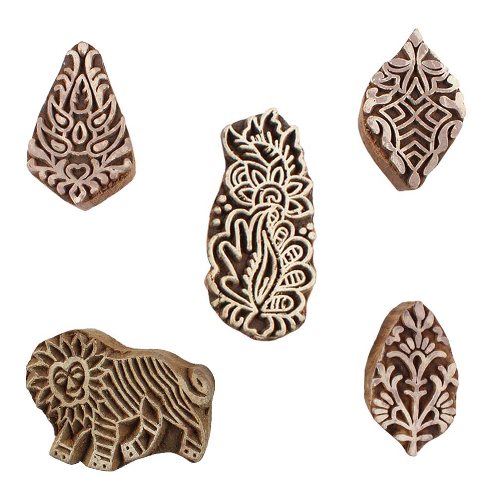 Set of 5 Piece New Mix Wooden Printing Blocks. Ideal for use on Fabric, Paper, Canvas, etc. These Blocks can be use to Print with Oil Colors, Fabric Colors, Water Colors, Acrylic Colors and Vegetable Colors.