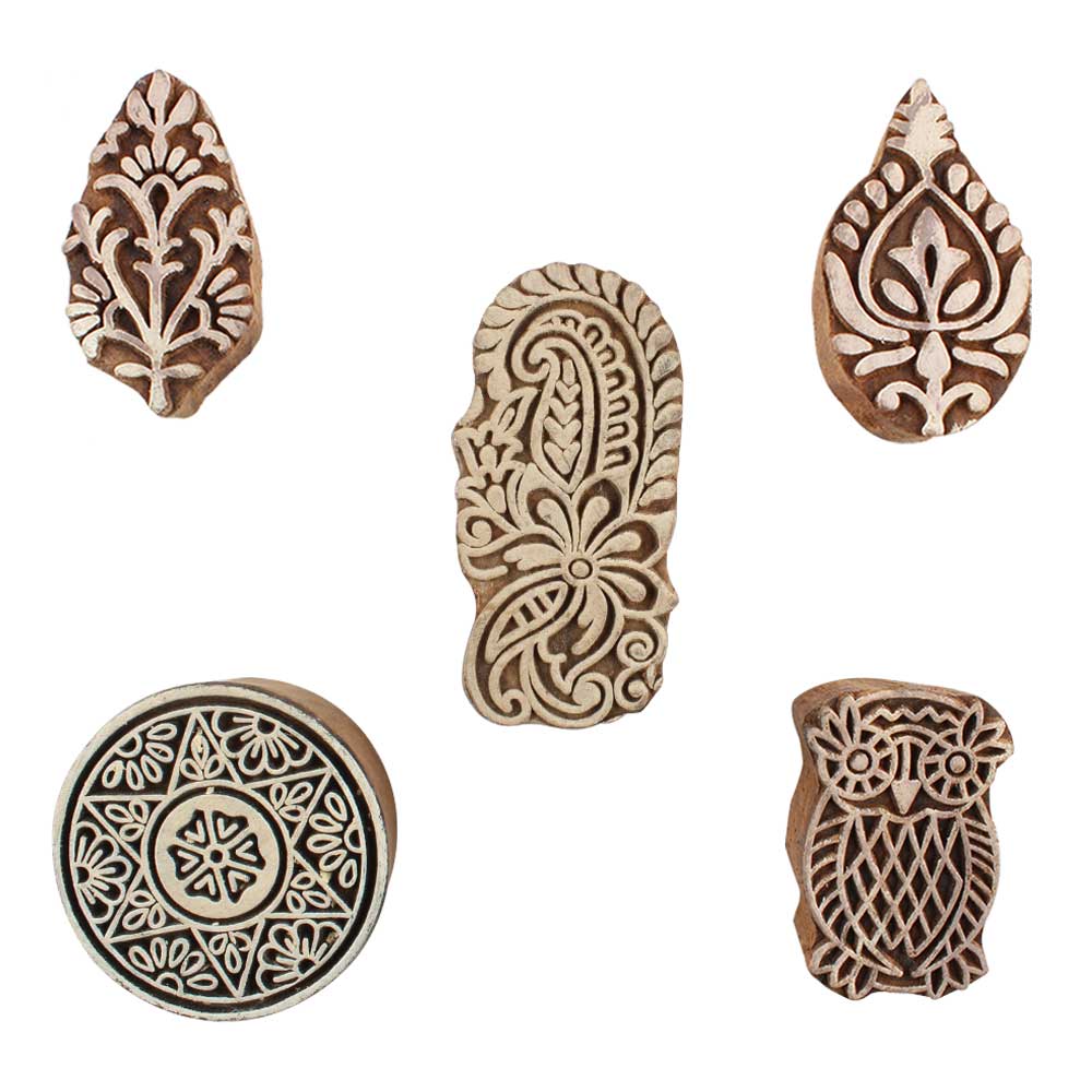 Set of 5 Piece New Mix Wooden Printing Blocks. Ideal for use on Fabric, Paper, Canvas, etc. These Blocks can be use to Print with Oil Colors, Fabric Colors, Water Colors, Acrylic Colors and Vegetable Colors.