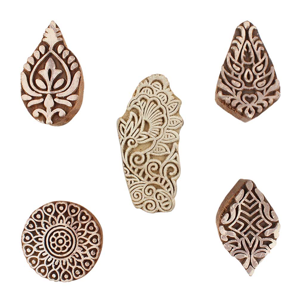 Set of 5 Piece New Mix Wooden Printing Blocks. Ideal for use on Fabric, Paper, Canvas, etc. These Blocks can be use to Print with Oil Colors, Fabric Colors, Water Colors, Acrylic Colors and Vegetable Colors.