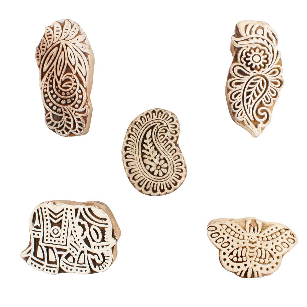 Set of 5 Piece New Mix Wooden Printing Blocks. Ideal for use on Fabric, Paper, Canvas, etc. These Blocks can be use to Print with Oil Colors, Fabric Colors, Water Colors, Acrylic Colors and Vegetable Colors.