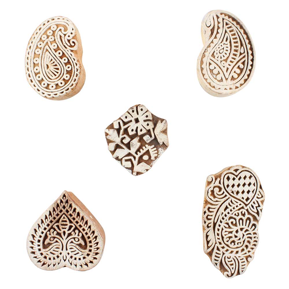 Set of 5 Piece New Mix Wooden Printing Blocks. Ideal for use on Fabric, Paper, Canvas, etc. These Blocks can be use to Print with Oil Colors, Fabric Colors, Water Colors, Acrylic Colors and Vegetable Colors.