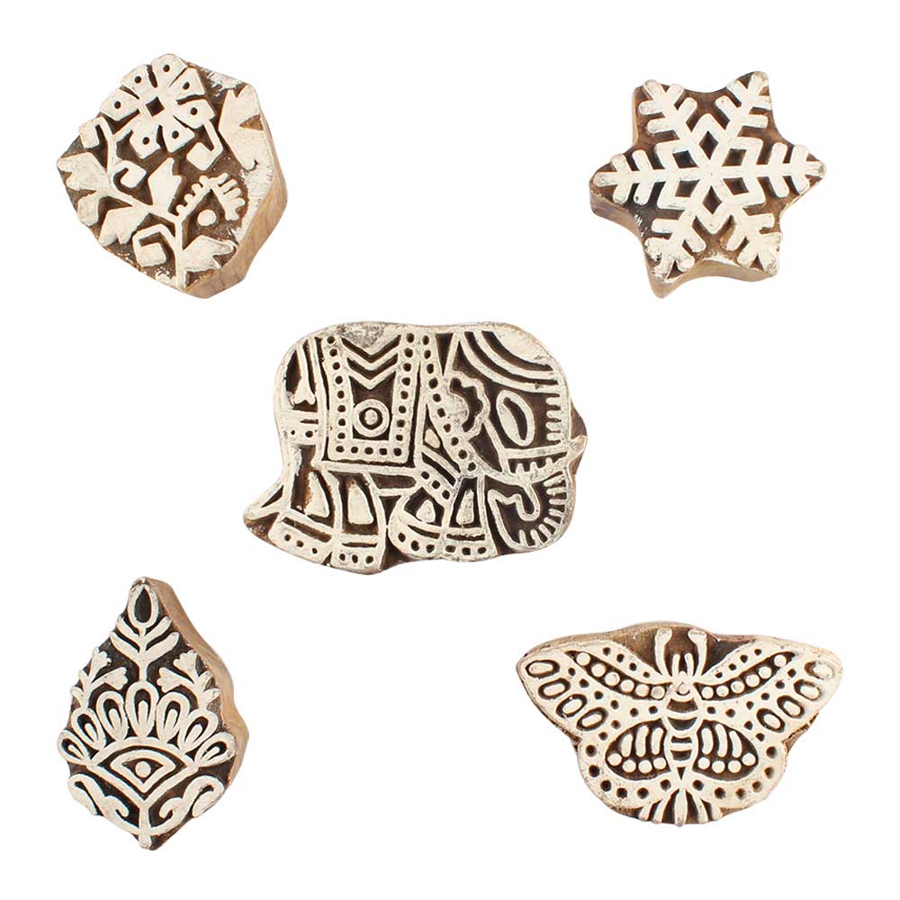 Set of 5 Piece New Mix Wooden Printing Blocks. Ideal for use on Fabric, Paper, Canvas, etc. These Blocks can be use to Print with Oil Colors, Fabric Colors, Water Colors, Acrylic Colors and Vegetable Colors.