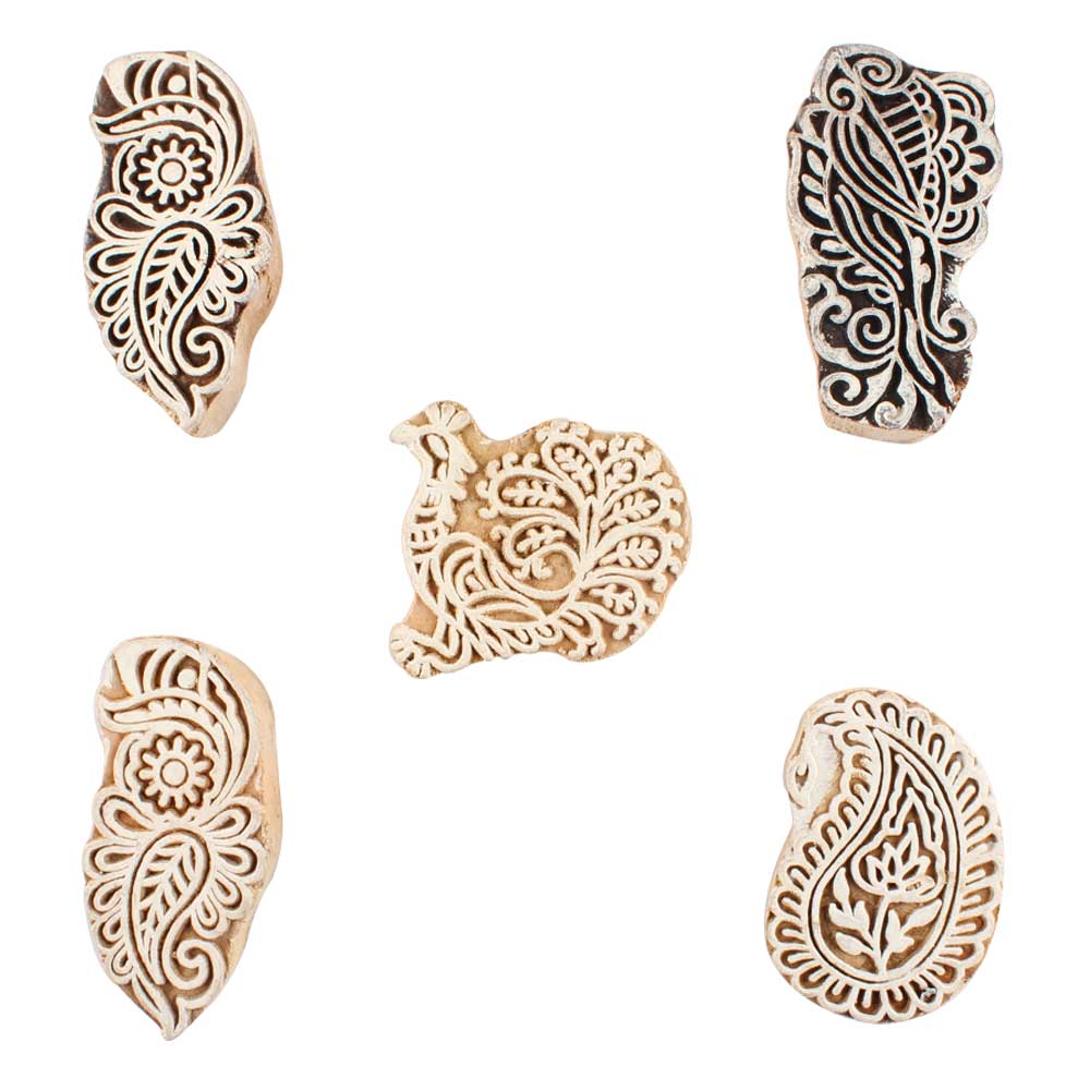 Set of 5 Piece New Mix Wooden Printing Blocks. Ideal for use on Fabric, Paper, Canvas, etc. These Blocks can be use to Print with Oil Colors, Fabric Colors, Water Colors, Acrylic Colors and Vegetable Colors.