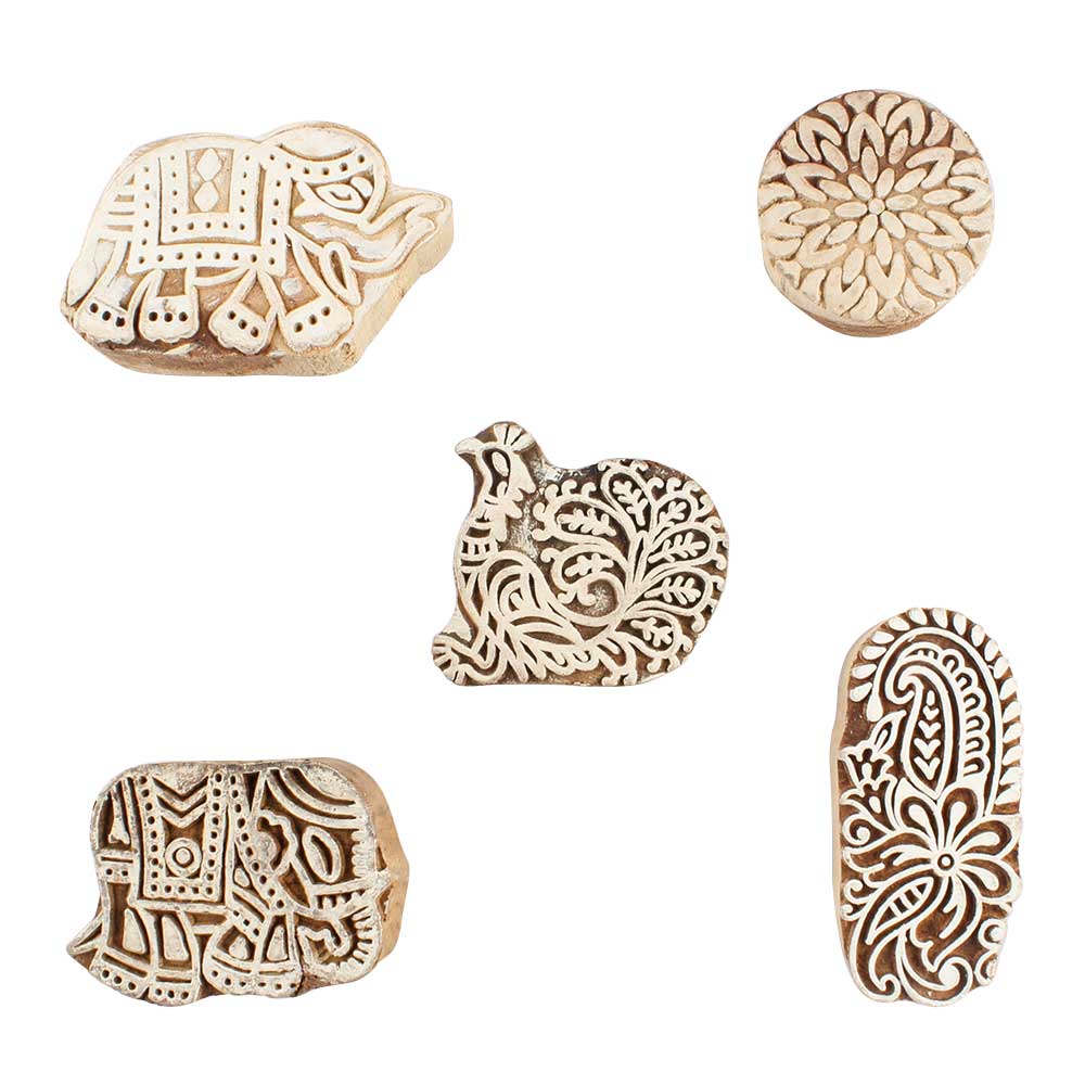 Set of 5 Piece New Mix Wooden Printing Blocks. Ideal for use on Fabric, Paper, Canvas, etc. These Blocks can be use to Print with Oil Colors, Fabric Colors, Water Colors, Acrylic Colors and Vegetable Colors.