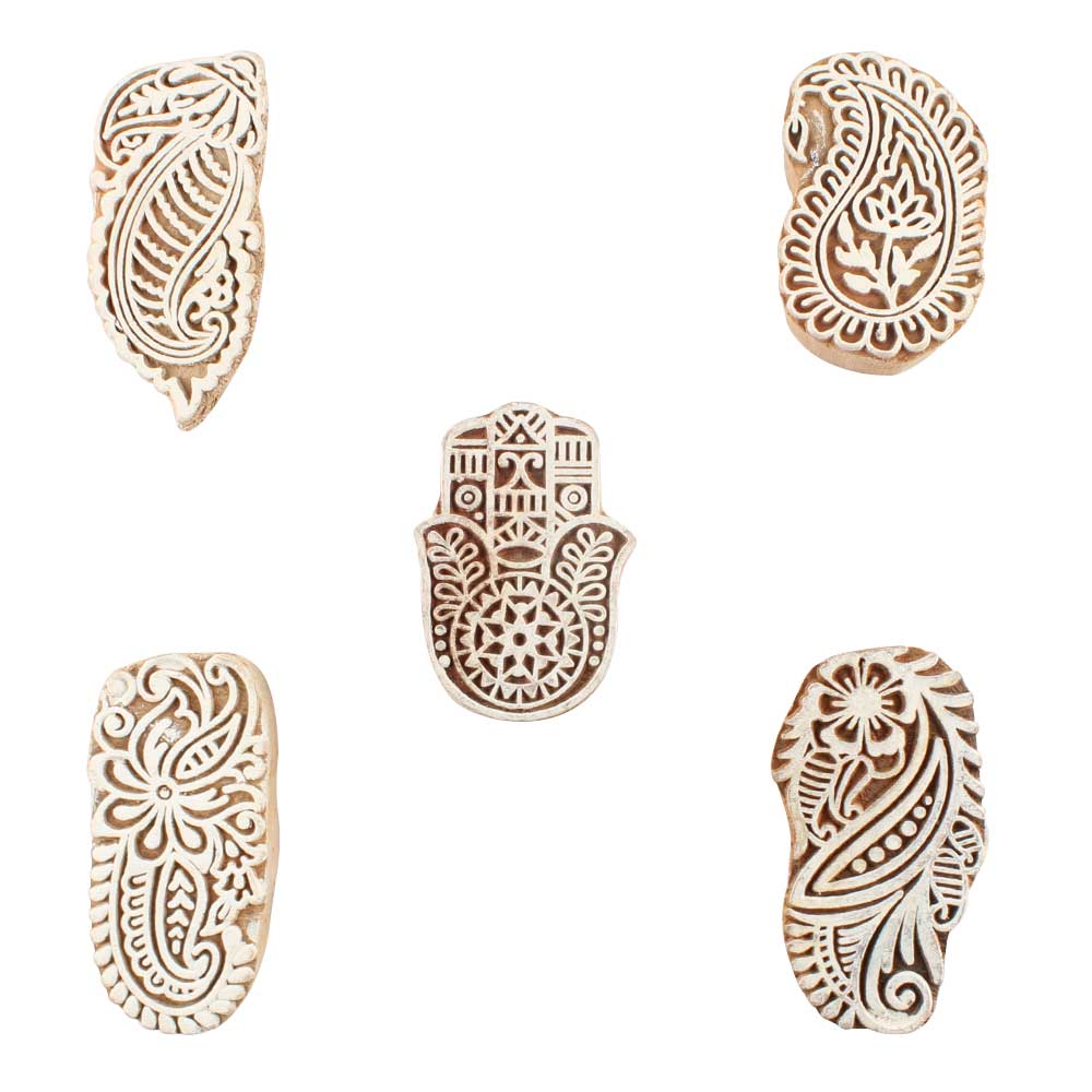 Set of 5 Piece New Mix Wooden Printing Blocks. Ideal for use on Fabric, Paper, Canvas, etc. These Blocks can be use to Print with Oil Colors, Fabric Colors, Water Colors, Acrylic Colors and Vegetable Colors.