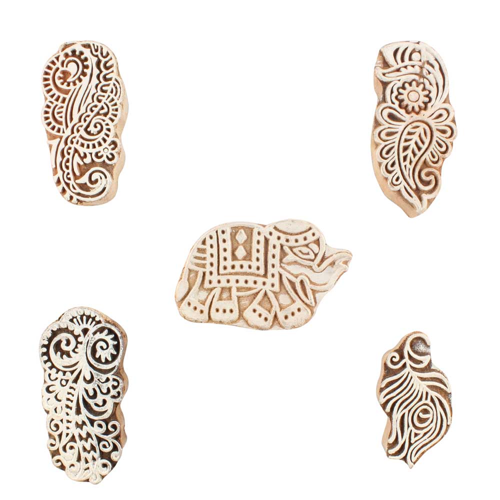 Set of 5 Piece New Mix Wooden Printing Blocks. Ideal for use on Fabric, Paper, Canvas, etc. These Blocks can be use to Print with Oil Colors, Fabric Colors, Water Colors, Acrylic Colors and Vegetable Colors.