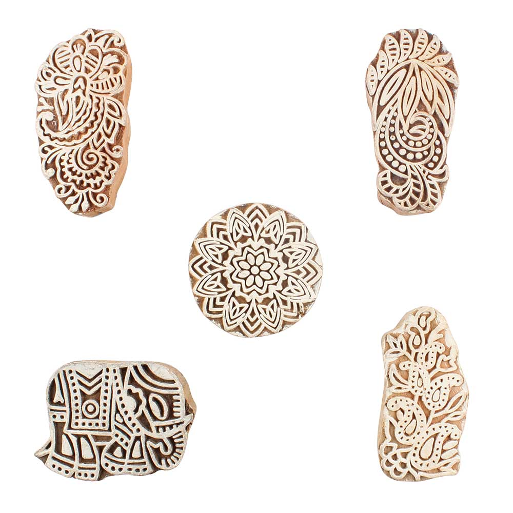 Set of 5 Piece New Mix Wooden Printing Blocks. Ideal for use on Fabric, Paper, Canvas, etc. These Blocks can be use to Print with Oil Colors, Fabric Colors, Water Colors, Acrylic Colors and Vegetable Colors.