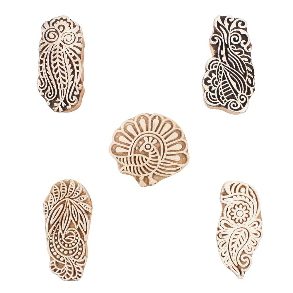 Set of 5 Piece New Mix Wooden Printing Blocks. Ideal for use on Fabric, Paper, Canvas, etc. These Blocks can be use to Print with Oil Colors, Fabric Colors, Water Colors, Acrylic Colors and Vegetable Colors.