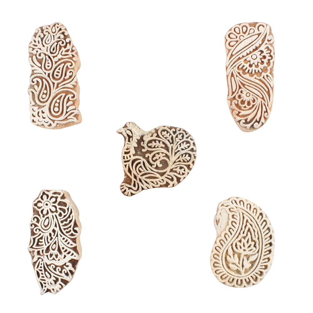 Set of 5 Piece New Mix Wooden Printing Blocks. Ideal for use on Fabric, Paper, Canvas, etc. These Blocks can be use to Print with Oil Colors, Fabric Colors, Water Colors, Acrylic Colors and Vegetable Colors.