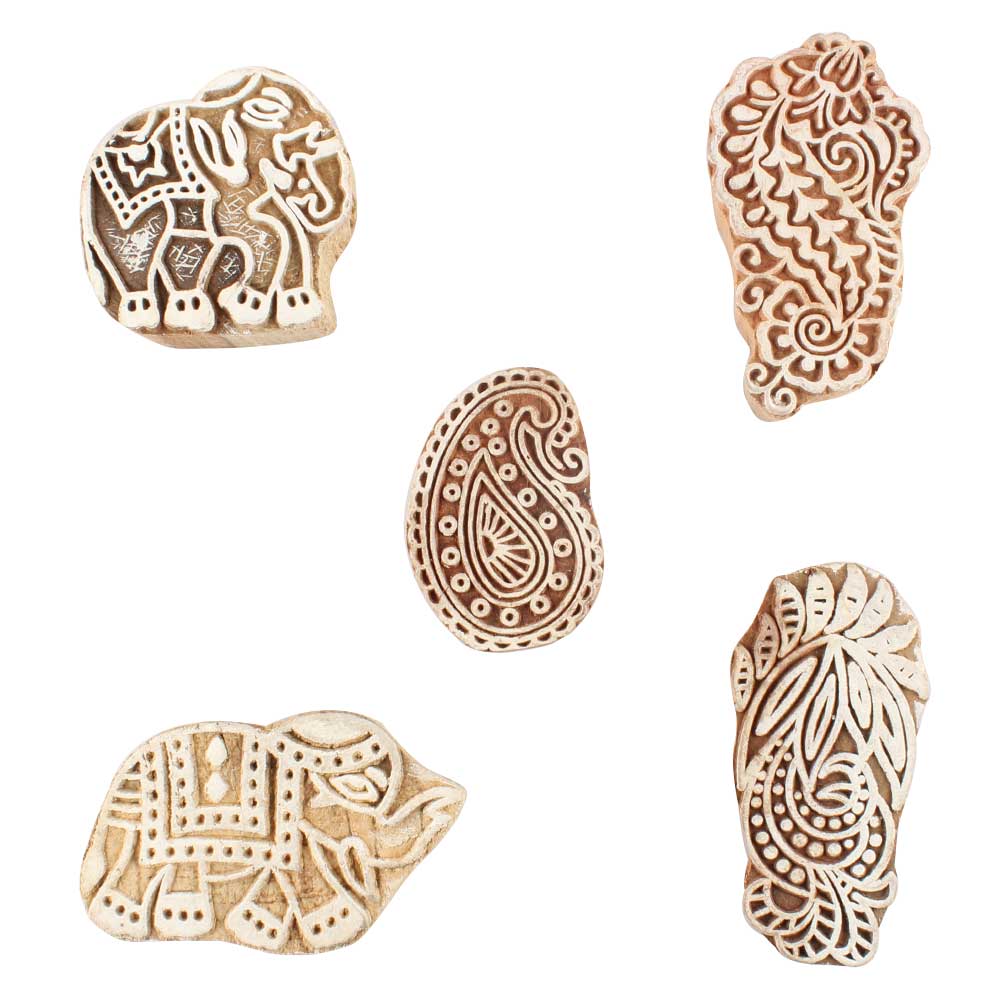 Set of 5 Piece New Mix Wooden Printing Blocks. Ideal for use on Fabric, Paper, Canvas, etc. These Blocks can be use to Print with Oil Colors, Fabric Colors, Water Colors, Acrylic Colors and Vegetable Colors.