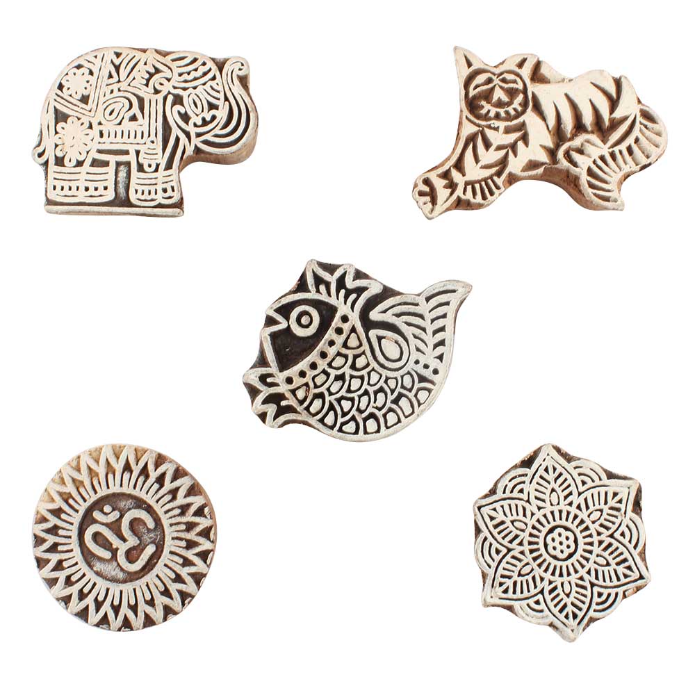Set of 5 Piece New Wooden Printing Block. Ideal for use on Fabric, Paper, Canvas, etc. These Blocks can be use to Print with Oil Colors, Fabric Colors, Water Colors, Acrylic Colors and Vegetable Colors.
